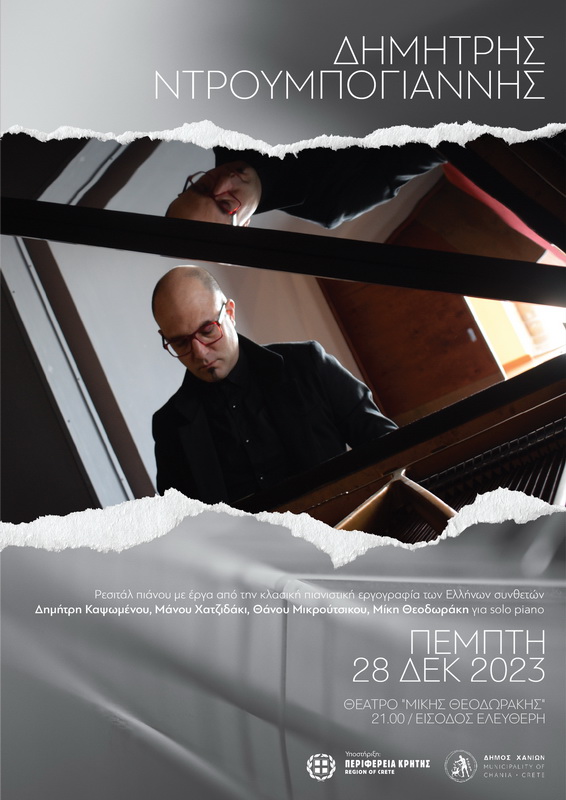 Η Περιφέρεια Κρήτης-Περιφερειακή Ενότητα Χανίων σε συνεργασία με το Δήμο Χανίων και την ΚΕΠΠΕΔΗΧ – ΚΑΜ διοργανώνουν Ρεσιτάλ Πιάνου του Δημήτρη Ντρουμπογιάννη, με έργα Κλασικής Μουσικής Ελλήνων Συνθετών, την Πέμπτη 28 Δεκεμβρίου 2023 και ώρα 21:00 στο θέατρο “Μίκης Θεοδωράκης”.