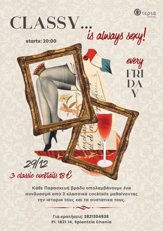 Κάθε Παρασκευή βράδυ παρουσιάζονται 3 classic cocktails στην οποία ο πελάτης θα έχει την ευκαιρία να μάθει την ιστορία του κάθε cocktail, αναλυτικά τα συστατικά τους και πως σερβίρονται σωστά! θα τα απολαμβάνει και τα 3 στην τιμή των 18€.