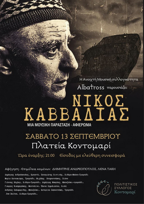 Στην Πλατεία Κοντομαρί οι Albatross θα παρουσιάσουν ένα μουσικοαφηγηματικό αφιέρωμα στον ποιητή Νίκο Καββαδία, το Σάββατο 13 Σεπτεμβρίου στις 21:00.