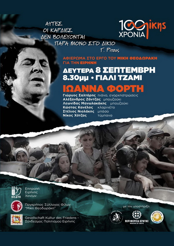 Ο Παγκρήτιος Σύλλογος Φίλων Μίκη Θεοδωράκη, η Επιτροπή Ειρήνης Χανίων και ο Σύνδεσμος για την Ειρήνη (Culture of Peace) που έχει έδρα το Τίμπιγκεν Γερμανίας και ιδρύθηκε απο τον Μίκη Θεοδωράκη και τον Henning Zeirock μουσικό και συνθέτη, σας προσκαλούν στη μουσική εκδήλωση για την Ειρήνη στο έργο του Μίκη Θεοδωράκη, αίτημα αναγκαίο και επίκαιρο σήμερα περισσότερο από ποτέ.