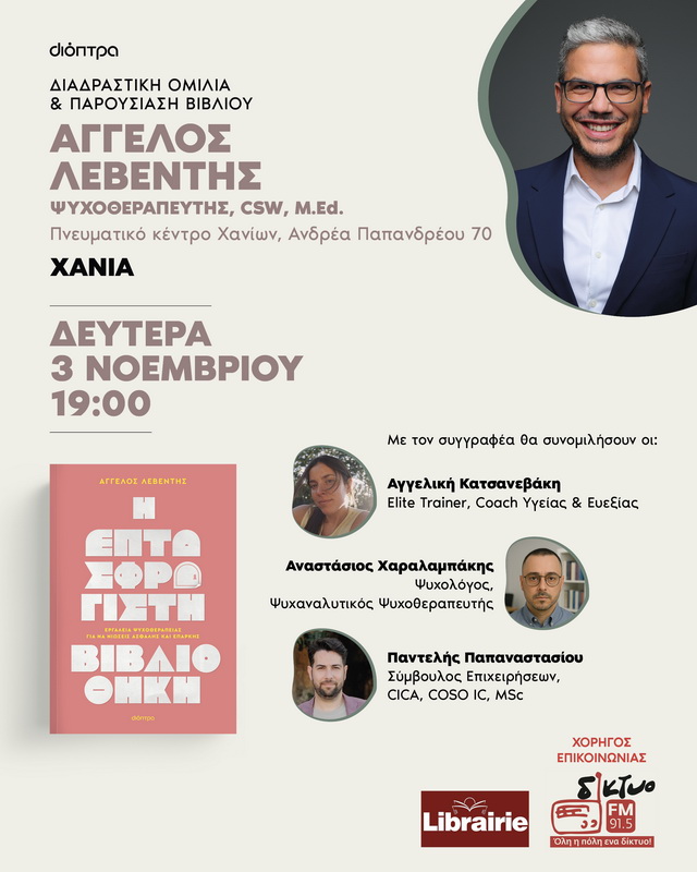 Το βιβλιοπωλείο Librairie και οι εκδόσεις Διόπτρα σας προσκαλούν στη διαδραστική ομιλία και παρουσίαση του βιβλίου του Άγγελου Λεβέντη Ψυχοθεραπευτής CSW, M.Ed.) Η Επτασφράγιστη Βιβλιοθήκη. Η εκδήλωση θα πραγματοποιηθεί τη Δευτέρα 3 Νοεμβρίου, ώρα 19:00, στο Πνευματικό Κέντρο Χανίων