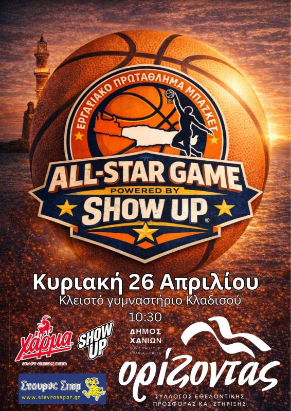 Η Εθελοντική Επιτροπή του Εργασιακού Πρωταθλήματος Μπάσκετ διοργανώνει την Κυριακή 26 Απριλίου, στις 10:30, στο Κλειστό Γυμναστήριο Κλαδισού, το All Star Game powered by Show Up, μια ξεχωριστή αθλητική διοργάνωση με φιλανθρωπικό χαρακτήρα, υπέρ του Συλλόγου Εθελοντικής Προσφοράς και Στήριξης «Ορίζοντας».