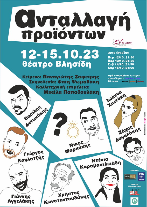 Την Πέμπτη 12, την Παρασκευή 13, το Σάββατο 14 και την Κυριακή 15 Οκτωβρίου, η Ε.Ν.Σταση τέχνης παρουσιάζει στο θέατρο Δημήτρης Βλησίδης τη νέα κωμωδία του Παναγιώτη Ζαφείρη με τίτλο: «Ανταλλαγή Προϊόντων»