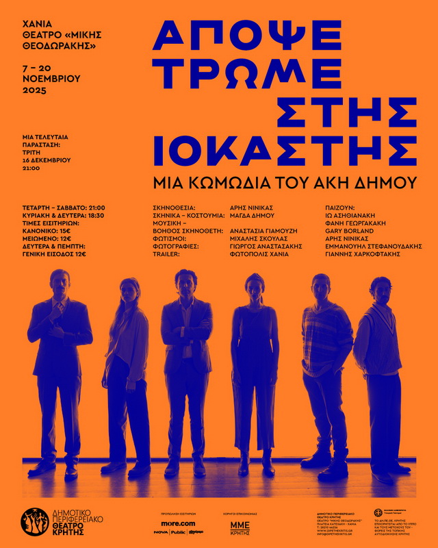 Το Δημοτικό Περιφερειακό Θέατρο Κρήτης παρουσιάζει την εκρηκτική κωμωδία του Άκη Δήμου «Απόψε τρώμε στης Ιοκάστης» σε σκηνοθεσία Άρη Νινίκα. Πρόκειται για ένα από τα κορυφαία έργα της σύγχρονης ελληνικής δραματουργίας, το οποίο θα κάνει πρεμιέρα στα Χανιά, στο θέατρο «Μίκης Θεοδωράκης» στις 7 Νοεμβρίου και στη συνέχεια θα περιοδεύσει σε όλη την Κρήτη.