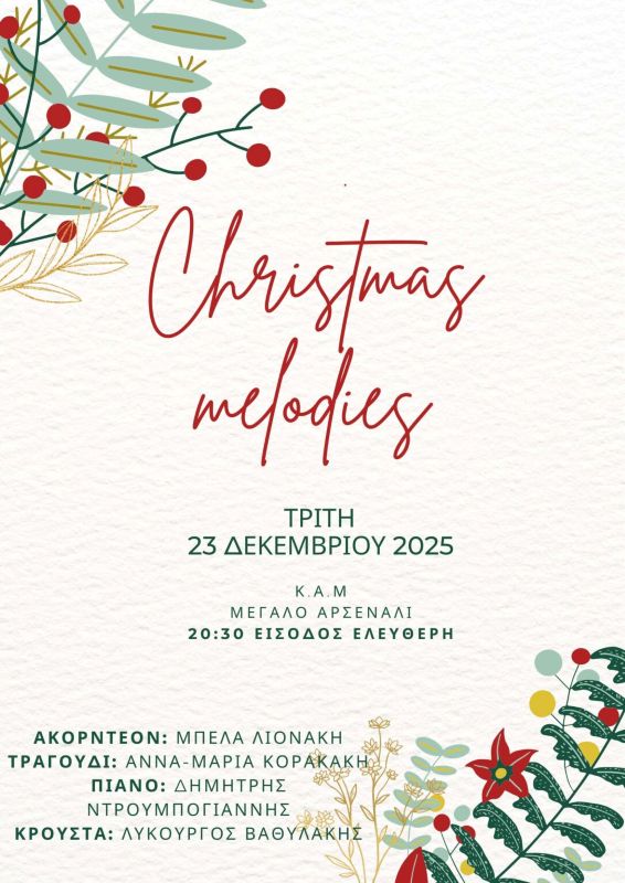 παρουσιάζουν μια ξεχωριστή μουσική εκδήλωση «ΧΡΙΣΤΟΥΓΕΝΝΙΑΤΙΚΕΣ ΜΕΛΩΔΙΕΣ», η οποία θα πραγματοποιηθεί την Τρίτη 23 Δεκεμβρίου στις 20:30 στο Μεγάλο Αρσενάλι με ελεύθερη είσοδο, προσφέροντας στο κοινό μια αξέχαστη βραδιά γεμάτη με τη μαγεία των Χριστουγέννων.
