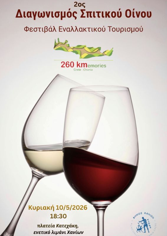 Έλα να παρουσιάσεις το δικό σου σπιτικό κρασί στον 2ο Διαγωνισμό Σπιτικού Οίνου, που διοργανώνει ο Δήμος Χανίων την Κυριακή 10 Μαΐου 2026 στις 18:30, στην πλατεία Κατεχάκη, στο πλαίσιο του 260Kmemories Festival 2026.