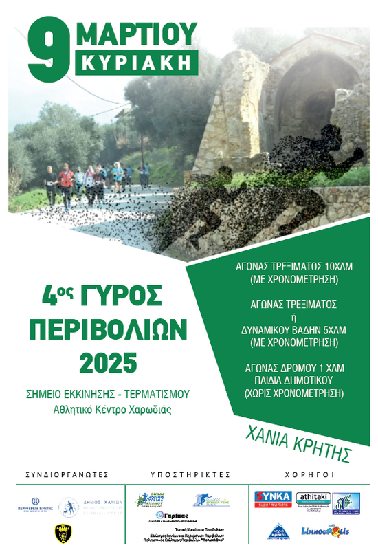 Η δράση θα πραγματοποιηθεί στις 9 Μαρτίου και συνδιοργανώνεται για 4η χρονιά από τον Αθλητικό Σύλλογο «ΕΘΝΙΚΗ ΦΥΣΙΚΗ ΑΓΩΓΗ ΠΕΡΙΒΟΛΙΩΝ Ο ΘΗΣΕΥΣ», τον Δήμο Χανίων, την Περιφέρεια Κρήτης – Περιφερειακή Ενότητα Χανίων μαζί με την Τοπική Κοινότητα Περιβολίων, τον Σύλλογο Γονέων και Κηδεμόνων Δημοτικού και Νηπιαγωγείου Σχολείου Περιβολίων, τον Πολιτιστικό και Φιλανθρωπικό Σύλλογο «ΓΑΡΙΠΑΣ», τον Πολιτιστικό Σύλλογο «ΠΟΛΥΠΛΑΝΟ», την Ομάδα Δρομέων Υγείας Κισάμου, με την υποστήριξη του Συλλόγου Δρομέων Υγείας Χανίων.