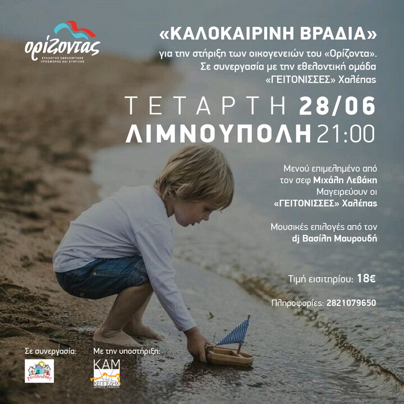 Την Τετάρτη 28 Ιουνίου 2023 και ώρα 21:00 θα πραγματοποιηθεί εκδήλωση στη «Λιμνούπολη» για την στήριξη των οικογενειών του «Ορίζοντα».