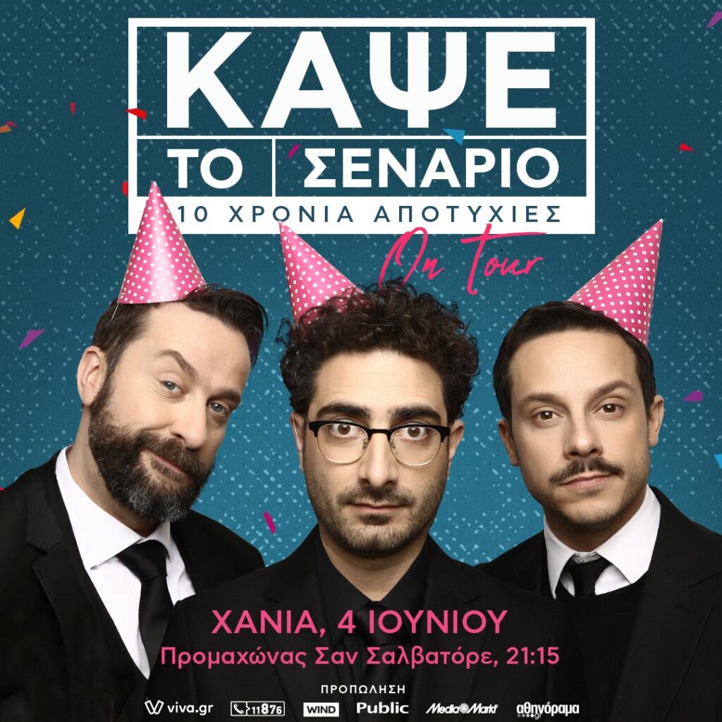 Φέτος μάλιστα, γιορτάζουν και τα 10 χρόνια από την ίδρυση της ομάδας με μια επετειακή περιοδεία σε πολλές πόλεις της Ελλάδας. Στις 4 Ιουνίου το «Κάψε το Σενάριο» πάει στα μαγευτικά Χανιά, στον Προμαχώνα Σαν Σαλβατόρε στις 21:15.