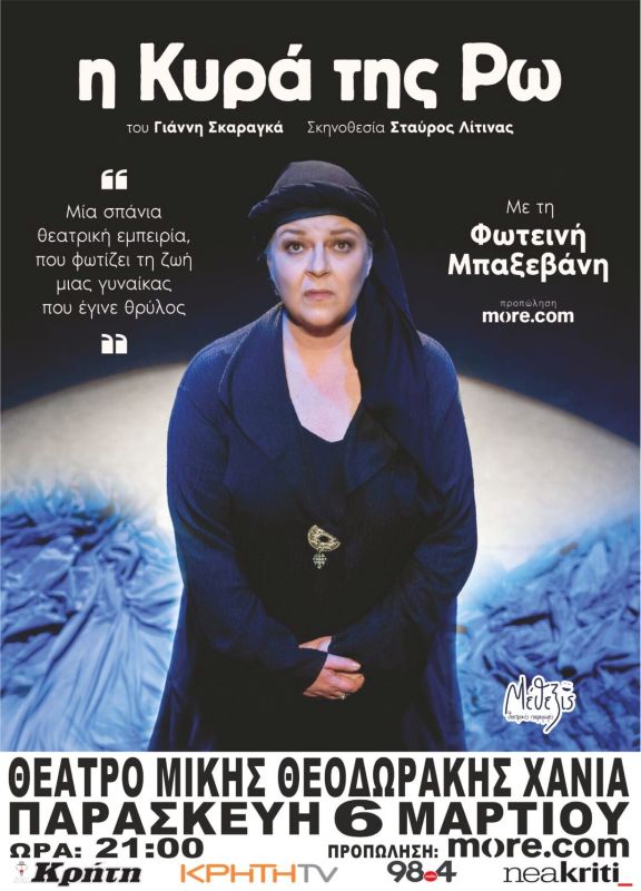Η παράσταση με τη λαμπρή πορεία, που συγκινεί εντός και εκτός συνόρων, βασίζεται στο ομώνυμο βιβλίο του διεθνώς βραβευμένου συγγραφέα, Γιάννη Σκαραγκά, και είναι εμπνευσμένη από τη ζωή της Δέσποινας Αχλαδιώτη. Η Αχλαδιώτη είναι η ελληνίδα, που έγινε γνωστή ως Κυρά της Ρω από το όνομα του μικρού νησιού, στο οποίο έζησε μόνη από τον Δεύτερο Παγκόσμιο Πόλεμο μέχρι τα βαθιά γεράματά της. Μετά την Τουρκική εισβολή στην Κύπρο, η Δέσποινα Αχλαδιώτη έγινε μια ηρωική φυσιογνωμία.