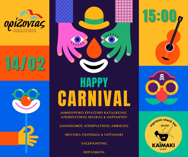 Ο Σύλλογος Εθελοντικής Προσφοράς και Στήριξης «Ορίζοντας» προσκαλεί όλους τους μικρούς του φίλους σε μια πολύχρωμη, χαρούμενη και γεμάτη φαντασία αποκριάτικη γιορτή, το Σάββατο 14 Φεβρουαρίου, στις 15:00 στο ΚAΪMAKI CAFE στην Πλατεία Κουνουπιδιανών, σε ένα απόγευμα γεμάτο παιχνίδι, δημιουργία και μουσική!