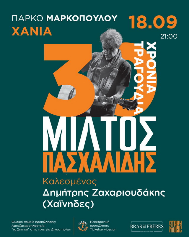 Φέτος ο Μίλτος κλείνει τριάντα χρόνια προσωπικής δισκογραφίας, και τα γιορτάζει μαζί μας στο Πάρκο Μαρκοπούλου, εδώ στα Χανιά!