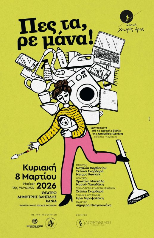 Στις 8 Μαρτίου οι γυναίκες γιορτάζουν, βάζουν τα καλά τους και το διασκεδάζουν. Η “Σκηνή Χωρίς Όρια”, με την υποστήριξη της Περιφέρειας Κρήτης και του δήμου Χανίων , ετοιμάζει μια βραδιά διασκεδαστική, παιχνιδιάρικη, διαδραστική και πολύ-πολύ αληθινή, με την παράσταση: “Πες τα, ρε μάνα”, εμπνευσμένη από το ομώνυμο βιβλίο της Χανιώτισσας συγγραφέως Αρτέμιδος Πλανάκη, εκδόσεις: Λογότυπο.
