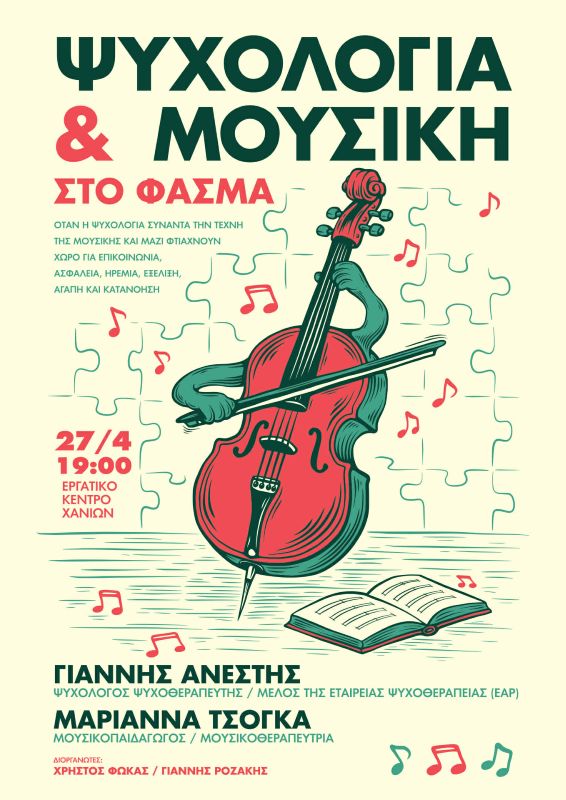 Την Δευτέρα 27 Απριλίου και ώρα 19:00 θα γίνει εκδήλωση στο εργατικό κέντρο Χανίων με θέμα ΨΥΧΟΛΟΓΊΑ και μουσική στο ΦΑΣΜΑ η είσοδος θα είναι ελεύθερη.