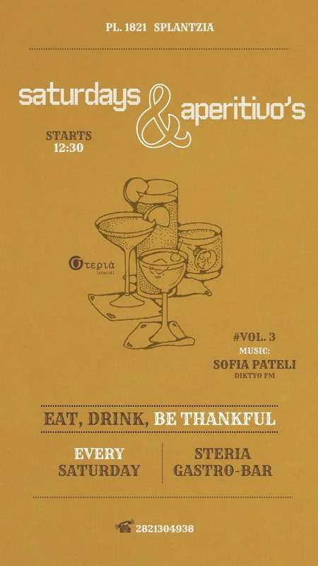 Κάθε Σάββατο στο Gastro-Bar Στεριά ξεκινάμε νωρίς το μεσημέρι (στις 14:00) μέχρι το απόγευμα με aperittivo cocktails (κλασικά και signature) και κρασιά από τον κρητικό αμπελώνα μαζί με μεζέδες (πλαισιώνοντάς το με ωραίες μουσικές επιλογές από διαφορετικούς dj της πόλης!