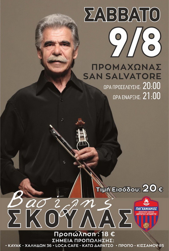 Τα Χανιά ετοιμάζονται να υποδεχθούν μια μοναδική μουσική βραδιά κάτω από τα αστέρια! Ο σπουδαίος λυράρης και ερμηνευτής της Κρήτης, Βασίλης Σκουλάς, έρχεται το Σάββατο 9 Αυγούστου 2025 στον ιστορικό Προμαχώνα San Salvatore, για μια συναυλία γεμάτη συναίσθημα, μνήμες και αυθεντική κρητική ψυχή.