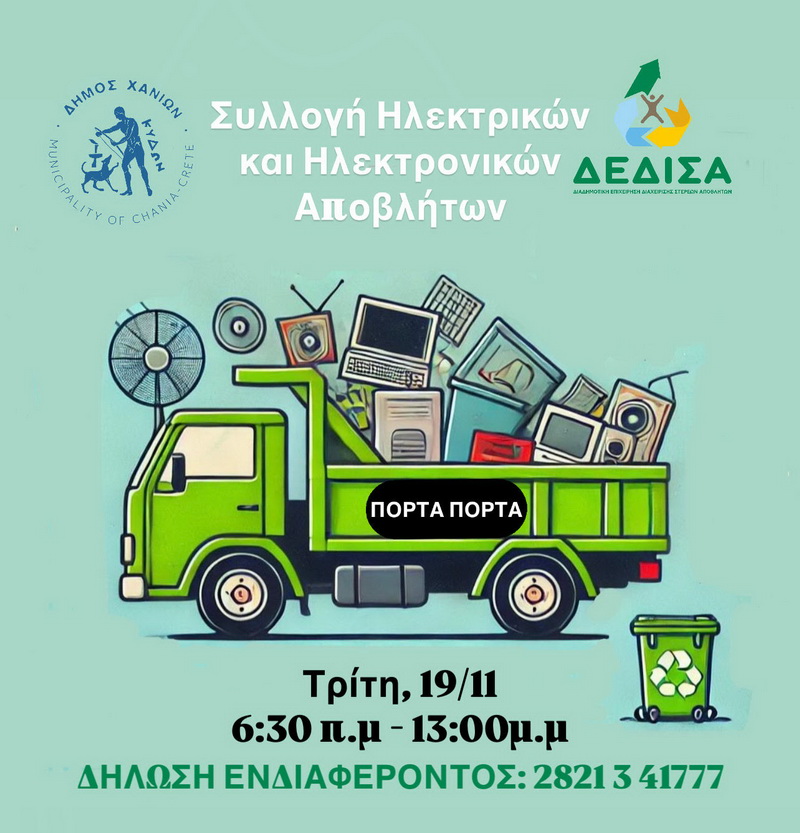 Ο Δήμος Χανίων σε συνεργασία με τη Διαδημοτική Επιχείρηση Διαχείρισης Στερεών Αποβλήτων [Δ.Ε.ΔΙ.Σ.Α. ΑΕ (ΟΤΑ)] πραγματοποιεί για ακόμα μία φορά τη συλλογή ηλεκτρικών και ηλεκτρονικών αποβλήτων με το σύστημα «πόρτα-πόρτα».