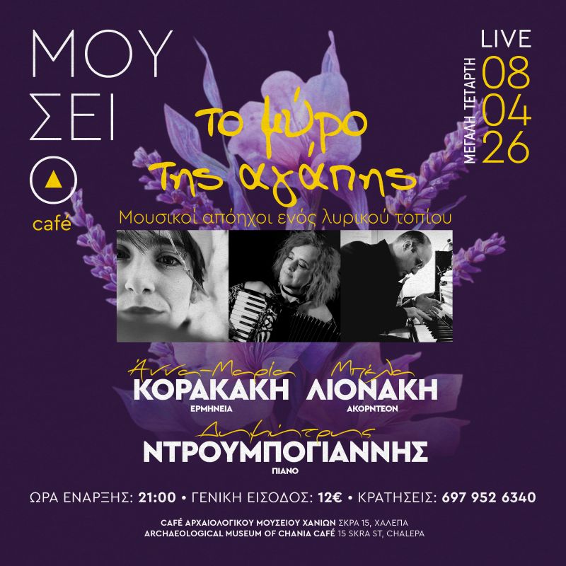 Τη Μεγάλη Τετάρτη 8 Απριλίου στο Καφέ του Αρχαιολογικού Μουσείου Χανίων, η Μπέλα Λιονάκη στο ακορντεόν, ο Δημήτρης Ντρουμπογιάννης στο πιάνο και η Άννα-Μαρία Κορακάκη στην ερμηνεία των τραγουδιών, μας προσκαλούν σε μια ατμοσφαιρική μουσική βραδιά με αριστουργηματικά έργα του ελληνικού μουσικού ρεπερτορίου.