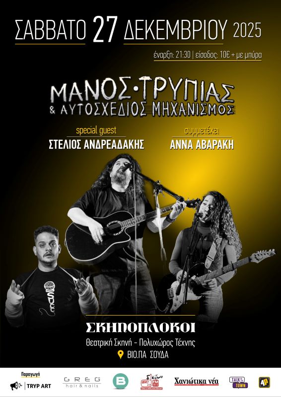 Ο Μάνος Τρυπιάς και ο Αυτοσχέδιος Μηχανισμός επιστρέφουν στη θεατρική σκηνή Σκηνοπλόκοι το Σάββατο 27 Δεκεμβρίου στις 21:30, για μία βραδιά με μουσική, λόγο, άφθονο γέλιο, και ζωντανή αλληλεπίδραση.