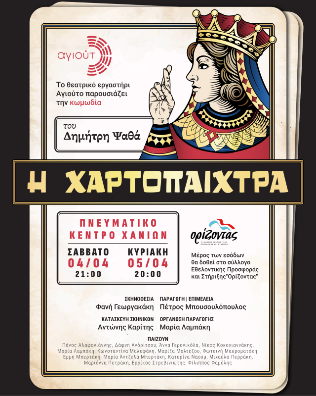 Το Θεατρικό Εργαστήρι Αγιούτο, του Πέτρου Μπουσουλόπουλου παρουσιάζει τη «Χαρτοπαίχτρα» στην πόλη μας — μόνο για δύο μοναδικές παραστάσεις! Σάββατο 4 & Κυριακή 5 Απριλίου 2026 στο Πνευματικό Κέντρο Χανίων.